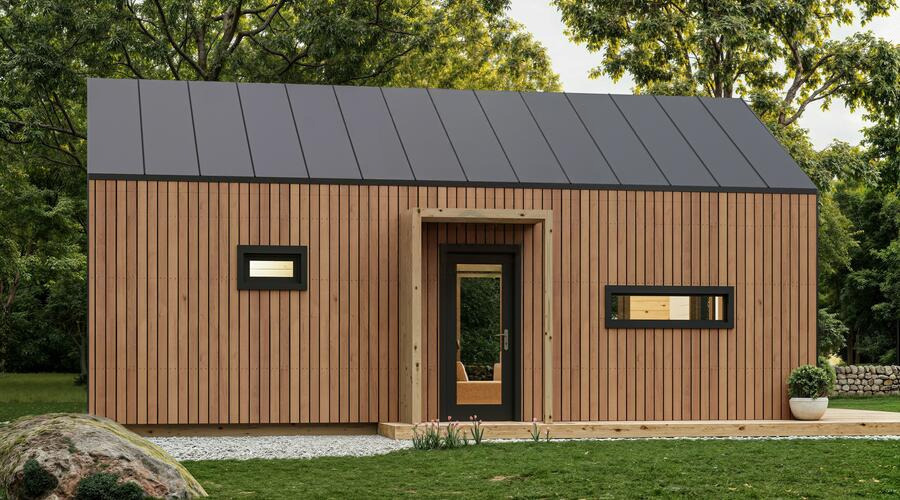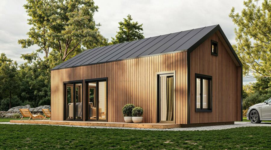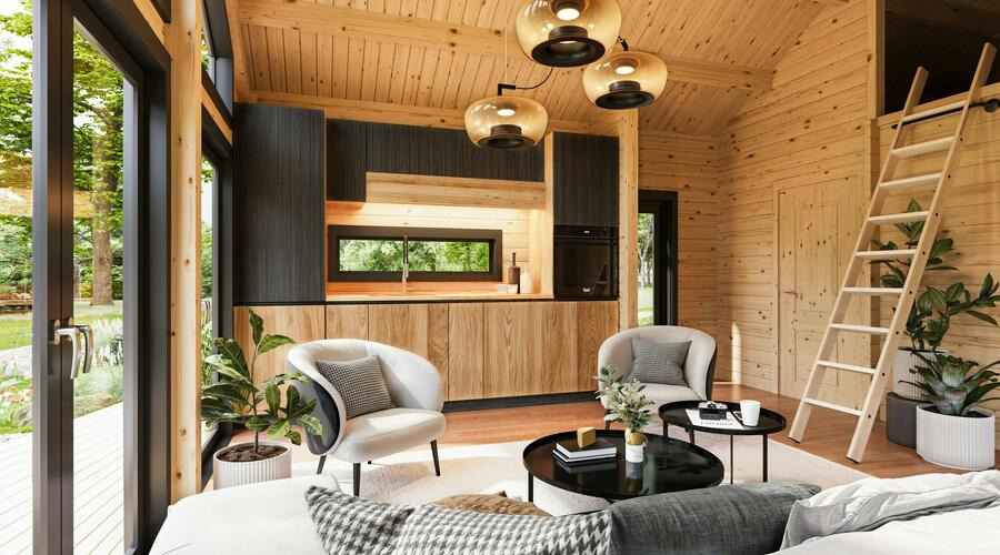 This stylish wooden house features a bright open-plan layout, a separate bedroom, big 5,4 m2 bathroom, a cozy loft space, and striking trapezoid windows that enhance natural light and modern character. With its high gabled roof, vertical cladding, and full insulation, it offers both charm and year-round comfort in a compact, efficient design.
